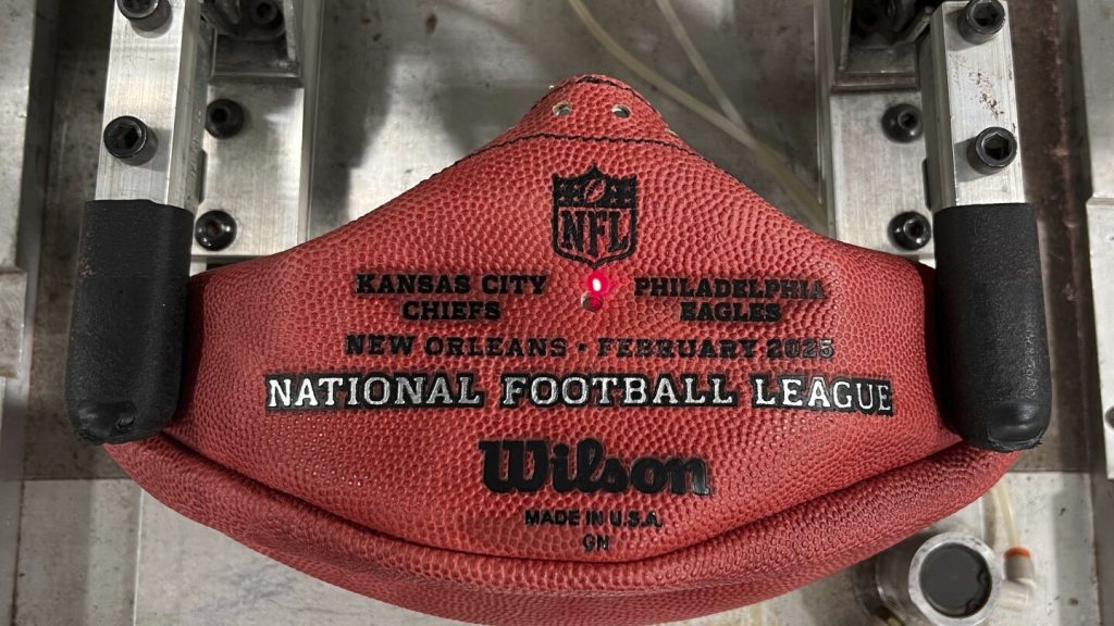 تقوم نيكول سنايدر بتشغيل الآلة داخل مصنع ويلسون سبورتنج جودز لكرة القدم الذي يطبع “فيلادلفيا إيجلز” و”كانساس سيتي تشيفز” على كرات لعبة Super Bowl الرسمية يوم الاثنين 27 يناير 2025، في آدا، أوهايو. (صورة AP / باتريك أفطورة-أورساجوس)