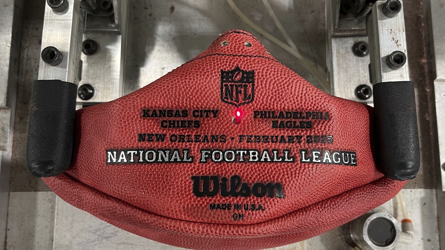 جزء من كرة القدم لمباراة Super Bowl القادمة بين فيلادلفيا إيجلز وكانساس سيتي تشيفز معروضة على آلة في مصنع ويلسون سبورتنج جودز لكرة القدم، الاثنين 27 يناير 2025، في أدا، أوهايو. (صورة AP / باتريك أفتورة-أورساجوس)