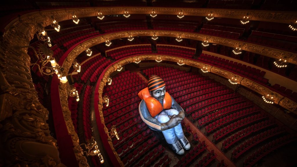 برشلونة ، إسبانيا (AP) – يبدو “اللاجئ القابل للنفخ” العملاق ، وهو يعانق ركبتيه ويرتدي سترة نجاة برتقالية زاهية ، ضعيفًا بينما يجلس بمفرده في بحر من الكراسي المخملية الحمراء الفارغة. قام الفنانان البصريان البلجيكيان شيليكينز وبيليمان، اللذان ابتكرا التمثال في عام 2015 في أعقاب أزمة اللاجئين في أوروبا، بإحضار هذا العمل الفني إلى دار أوبرا Gran Teatre del Liceu في برشلونة على أمل لفت الانتباه مرة أخرى إلى محنة اللاجئين.