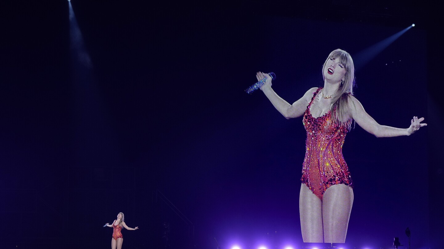 تؤدي تايلور سويفت عرضًا في Paris Le Defense Arena كجزء من حفلها الموسيقي Eras Tour في باريس، الخميس 9 مايو، 2024. (AP Photo/Lewis Joly)