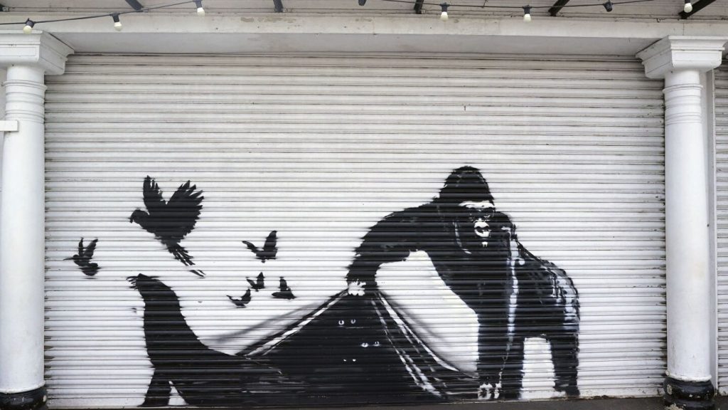 جدارية لفنان الشارع المراوغ بانكسي أظهرت الصورة غوريلا تحمل بوابة المدخل بينما كانت الطيور تحلق في الجو وأسد البحر يبتعد. ظهرت ثلاث مجموعات من العيون من الظلام في الداخل.