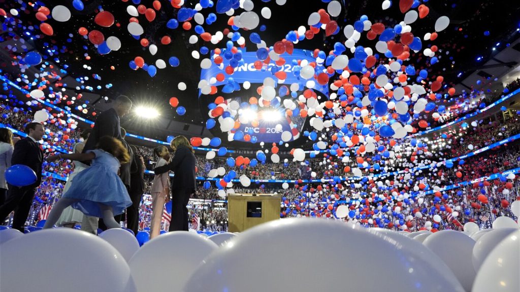 وفي النهاية، كانت تلك اللحظات الأكثر تقليدية في المؤتمرات الانتخابية تأتي من خلال شاشات التلفزيون: المرشحة وزميلتها في الترشح وأسرتيهما يستمتعون بتصفيق المؤيدين، بينما كانت البالونات تطفو من العوارض الخشبية.