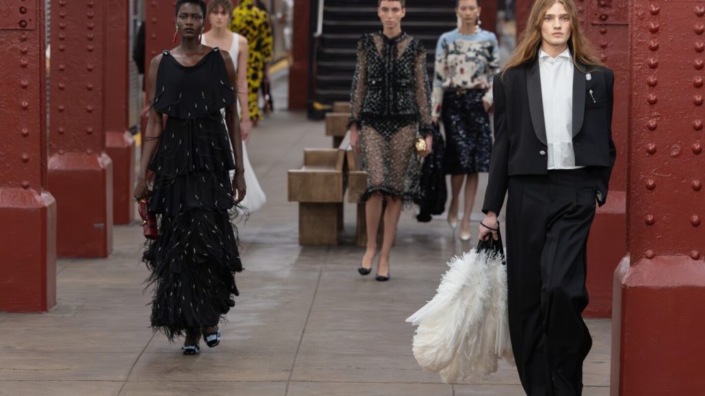 جلس الضيوف على مقاعد تشبه مقاعد المترو، بينما كان الإعلان الصوتي المألوف لسكان نيويورك يتردد: “ابتعدوا عن الأبواب المغلقة!”. ثم، وبشكل غير متوقع، وصل “قطار” – أو بالأحرى، خرجت منه العارضات، لتبدأ بذلك عرضًا فريدًا من نوعه. حضر العرض حشد من المشاهير، بما في ذلك A$AP Rocky، وتيلدا سوينتون، وآيو إديبيري، وكريستين ستيوارت، وصوفيا كوبولا، وغيرهم الكثير، مما أضفى على الحدث بريقًا إضافيًا.