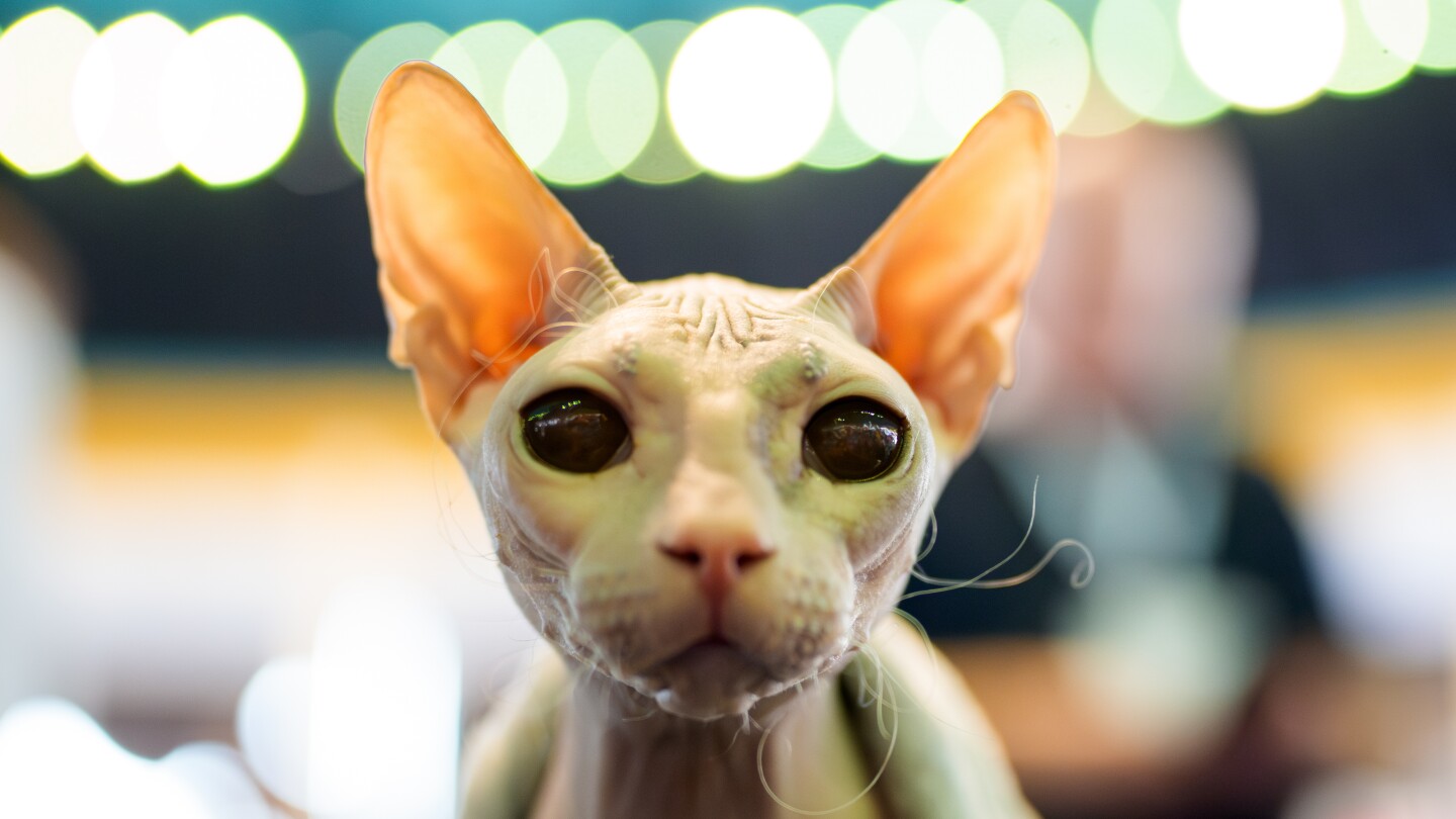 قطة كورنيش ريكس تصل إلى لعبة خلال معرض FIFe العالمي رومانيا 2025، وهو أكبر حدث للقطط في العالم، يقام في بلد مختلف كل عام، والذي يجمع أكثر من 1000 قطة من أكثر من 30 دولة، في بوخارست، رومانيا، السبت، 25 أكتوبر 2025. (AP Photo / Andreea Alexandru)