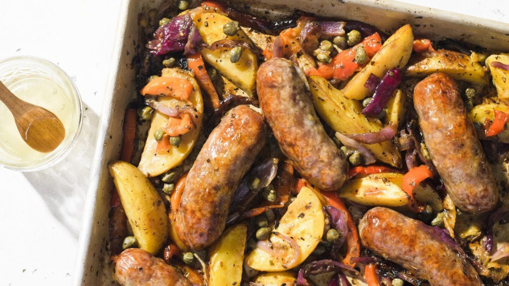في هذه الوصفة من كتابنا “اطبخ ما لديك”، الذي يعتمد على المواد الغذائية الأساسية لتجميع وجبات سهلة طوال الأسبوع، نقوم بطهي النقانق الإيطالية اللذيذة فوق البطاطس والبصل والفلفل الحلو حتى تضفي عصائر اللحم نكهة على الخضار.