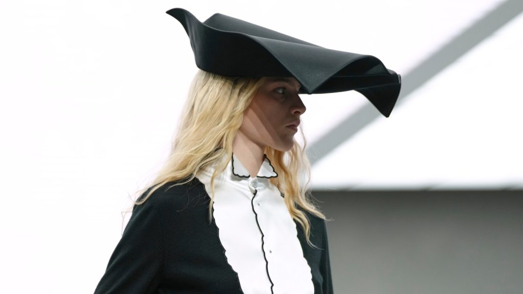 ما تلا ذلك لم يكن ثورة بل سلسلة من الإيماءات التحقيق. لم يكن أندرسون أبدًا من يتفجر رموز المنزل ؛ في لوي ، ومرة ​​أخرى في ظهور رجال ديور في يونيو ، كانت طريقته هي الانحناء وإعادة الصياغة. تلك الغريزة التي يتم من خلالها هنا. المظلات الظلية تراجعت ، فضفاضة تقريبا. توج الأميرالرجس الحاجب. اندلع الدانتيل الأسود مثل الأقواس – أو الخفافيش – من الخلف. كان أكثر ما يلفت النظر هو شكل “بالون المزدوج” المتكرر مخفيًا تحت التنانير ، مما ينتج عنه صورة ظلية غريبة مثل فرساي تشبه فرساي-وهي عبارة عن ريف خبيث على عدادات القرن الثامن عشر صنعت غريبة في الوقت الحاضر.