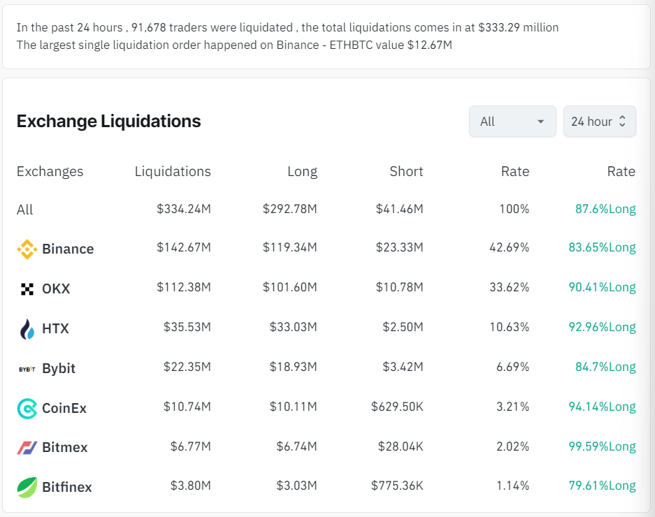 ردًا على ذلك، استجاب سوق العملات المشفرة بتصفية ما يقرب من 335 مليون دولار من مراكز مشتقات العملات المشفرة ذات الرافعة المالية في إطار زمني يبلغ 24 ساعة فقط، وهو الأكبر منذ انهيار 5 أغسطس، وفقًا لأحدث البيانات الصادرة عن منصة بيانات تبادل المشتقات المجمعة. كوينجلاس.