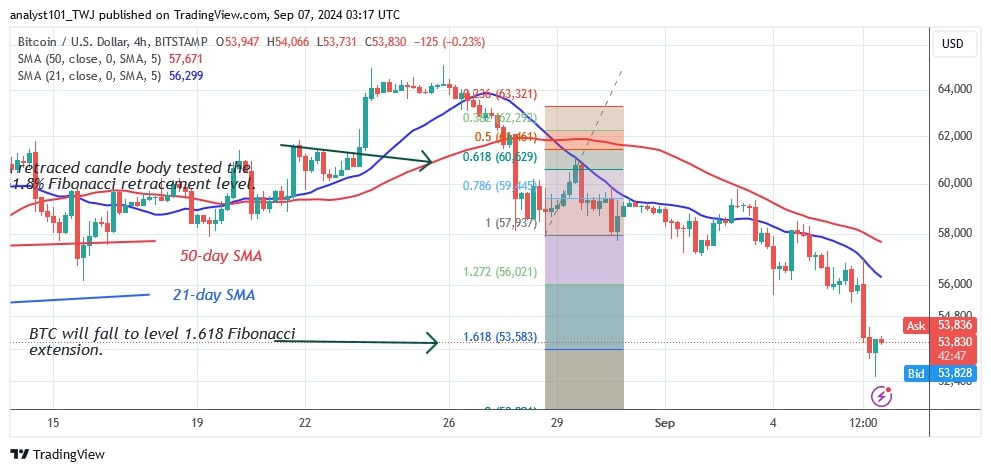 انخفض سعر البيتكوين وعاد إلى مستوى السعر التاريخي في 5 يوليو. في انخفاض السعر في 28 أغسطس، قام سعر البيتكوين بالتصحيح صعودًا واختبر خط تصحيح فيبوناتشي 61.8٪ بجسم شمعدان. يعني التراجع في اتجاه هبوطي أن قيم العملات المشفرة ستستمر في الانخفاض. انخفض سعر البيتكوين إلى امتداد فيبوناتشي 1618 (53585 دولارًا). ومع ذلك، فمن غير الواضح ما إذا كان الدعم الحالي سيصمد.