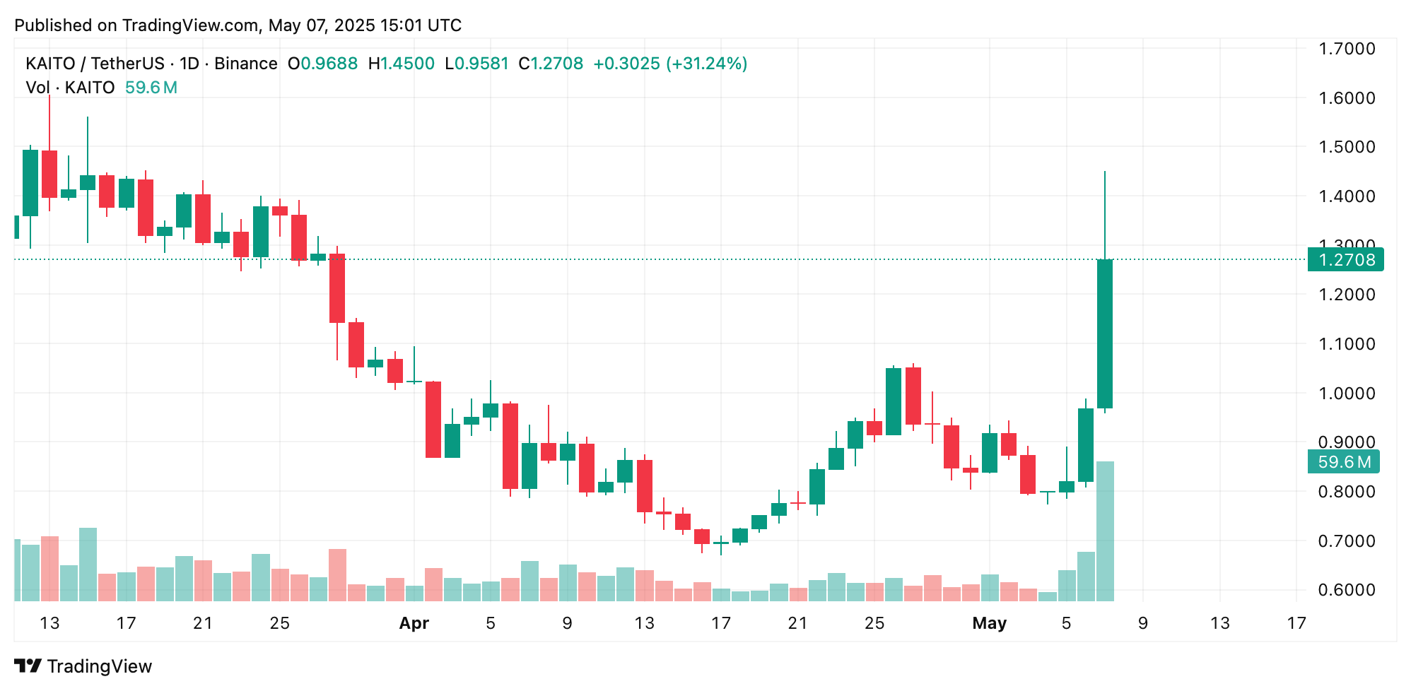 كان كايتو (Kaito) في اليوم هو Kaito (Kaito) ، حيث وصل إلى 48.06 ٪ إلى 1.262475 دولار ، مدعومًا بالفوائد المتجددة. كما نشرت الرموز المميزة Meme و Micro-Cap عوائد كبيرة ، حيث ارتفعت MOG Coin (MOG) بنسبة 17.12 ٪ ورمز الكلاب في Bitcoin (DOG) يتسلق 10.5 ٪ مقابل الدولار الأمريكي.