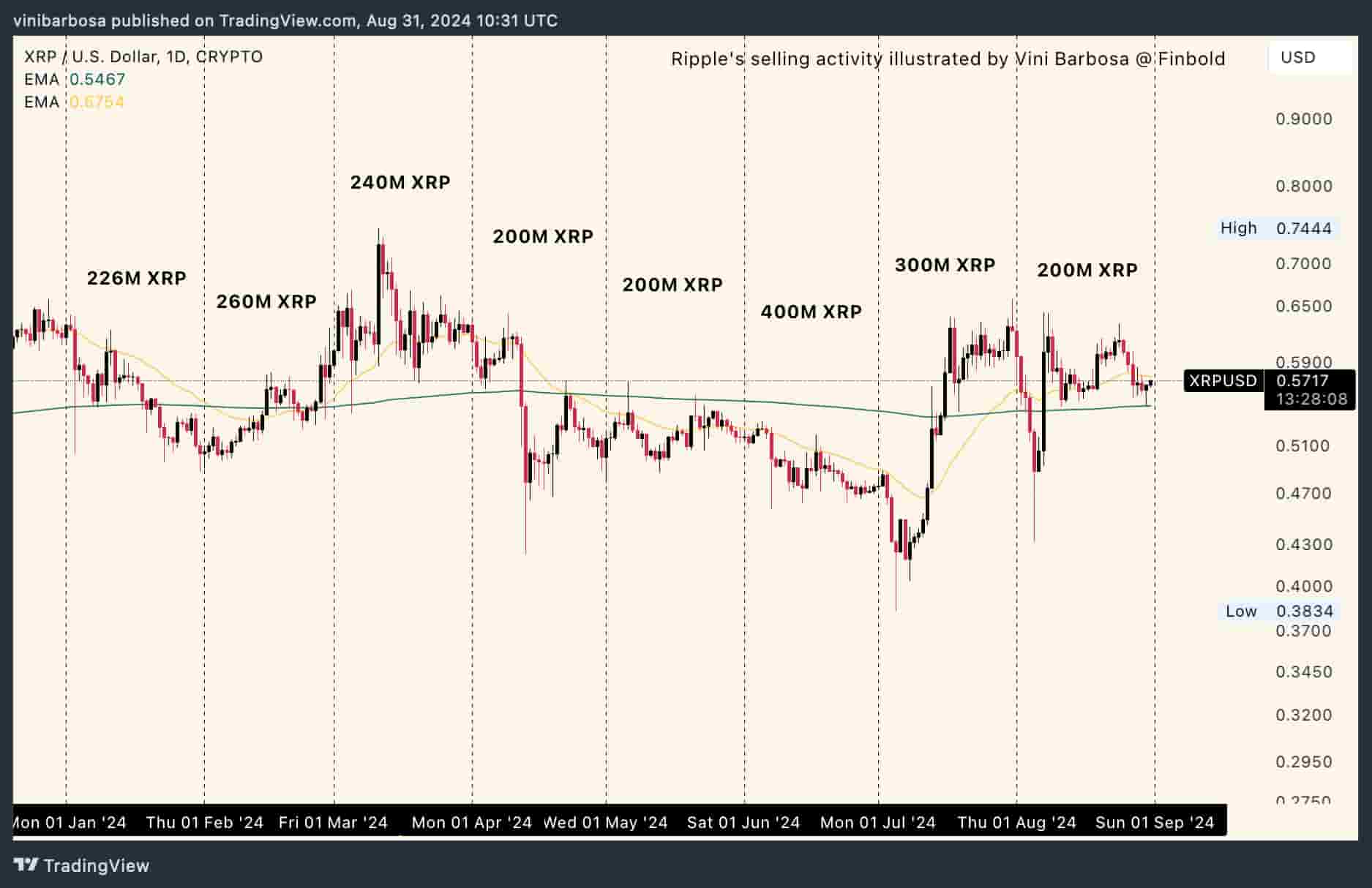 في وقت كتابة هذه السطور، يتم تداول XRP عند 0.57 دولار، بانخفاض 9.40% منذ بداية العام. منذ 1 يناير 2024، باعت Ripple أكثر من 2.02 مليار XRP من حساب الخزانة الخاص بها، بقيمة حوالي 1.15 مليار دولار.