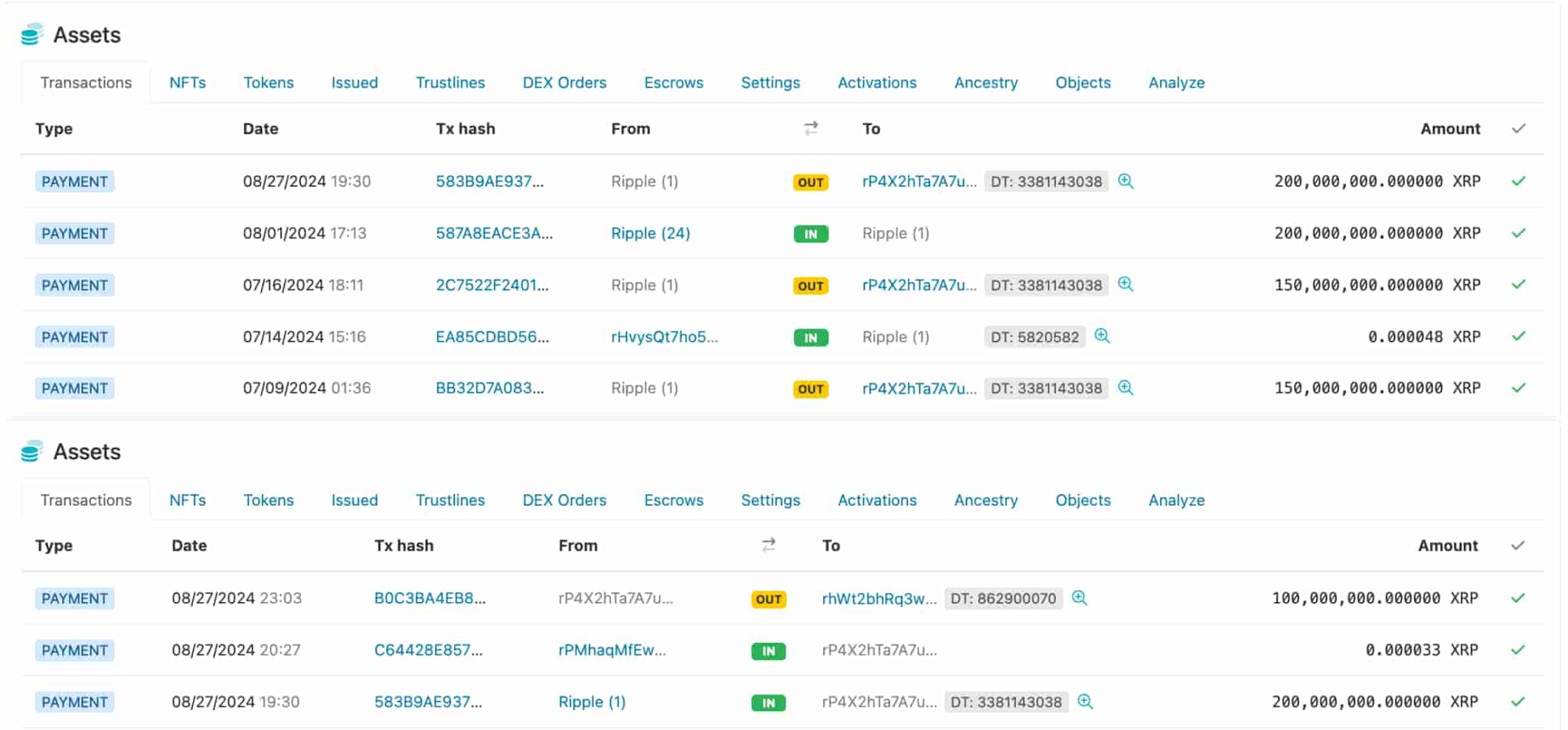 منذ مايو 2024، استخدمت Ripple هذين الحسابين المسمىين لعمليات إلغاء القفل الشهرية. قبل ذلك، استخدمت الشركة حسابي “Ripple (22)” و”Ripple (23)”. لا يزال أكثر من 43 مليار XRP محتجزة في حسابات الضمان لعمليات إلغاء القفل حتى ديسمبر 2027.