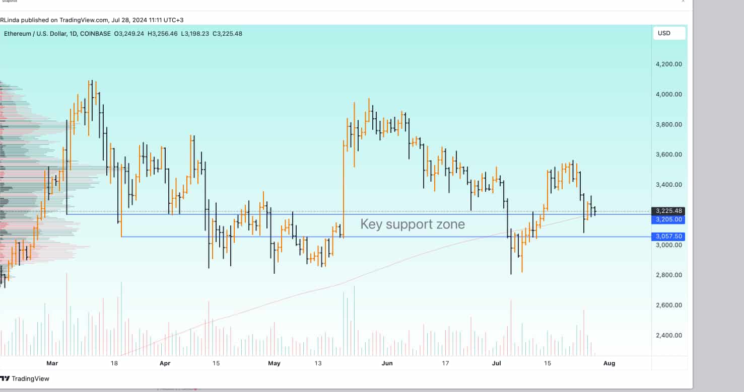 الهدف الأساسي لثيران الإيثريوم هو الحفاظ على الدفاع فوق منطقة الاهتمام عند 3200 دولار. يعد الحفاظ على مستوى الدعم هذا أمرًا بالغ الأهمية لتهيئة المسرح لاختراق صعودي محتمل.