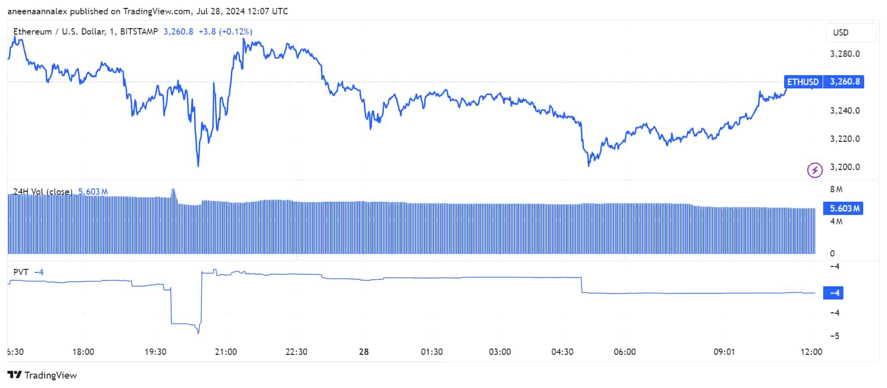 اعتبارًا من التحديث الأخير، يتم تداول الإيثريوم عند 3,249 دولارًا، مما يعكس انخفاضًا بنسبة 0.66% على الرسم البياني اليومي.