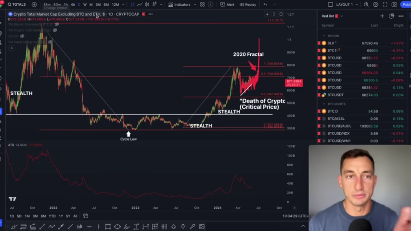يقول Pizzino أيضًا أن TOTAL3، الذي يقيس القيمة السوقية الكاملة للعملات المشفرة إلى جانب Bitcoin Ethereum (ETH) والعملات المستقرة، يبدو مشابهًا للاختراق المفاجئ لعام 2020.