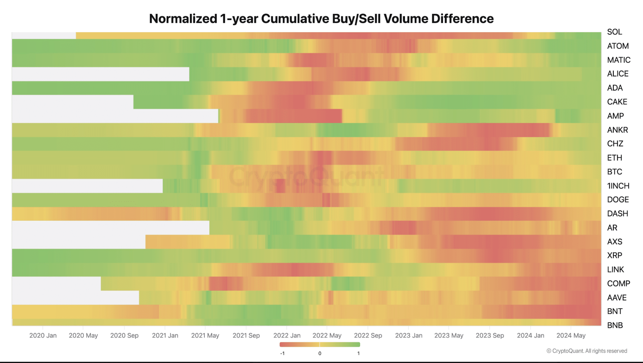 كما قدم جو أيضًا خريطة حرارية لفرق حجم الشراء / البيع التراكمي الطبيعي لمدة عام واحد لمختلف العملات البديلة، مما يوضح ضغوط الشراء والبيع بمرور الوقت. سولانا أظهرت أسهم (SOL) فترات شراء وبيع قوية متناوبة، مع إظهار النشاط الأخير زيادة في الاهتمام بالشراء. كما أظهرت أسهم Cosmos (ATOM) وPolygon (MATIC) ضغوط شراء متزايدة على الرغم من اتجاهات النشاط المتباينة.
