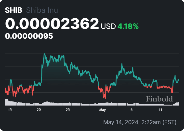 في هذه الأثناء، يتم تداول Shiba Inu بسعر 0.00002362 دولار، مما يشير إلى مكاسب بنسبة 7.18% خلال الـ 24 ساعة الماضية، بزيادة قدرها 0.11% خلال الأيام السبعة السابقة، فضلاً عن تقدم بنسبة 4.18% في الشهر الماضي، بالإضافة إلى لينمو بنسبة 130.04% منذ مطلع العام.