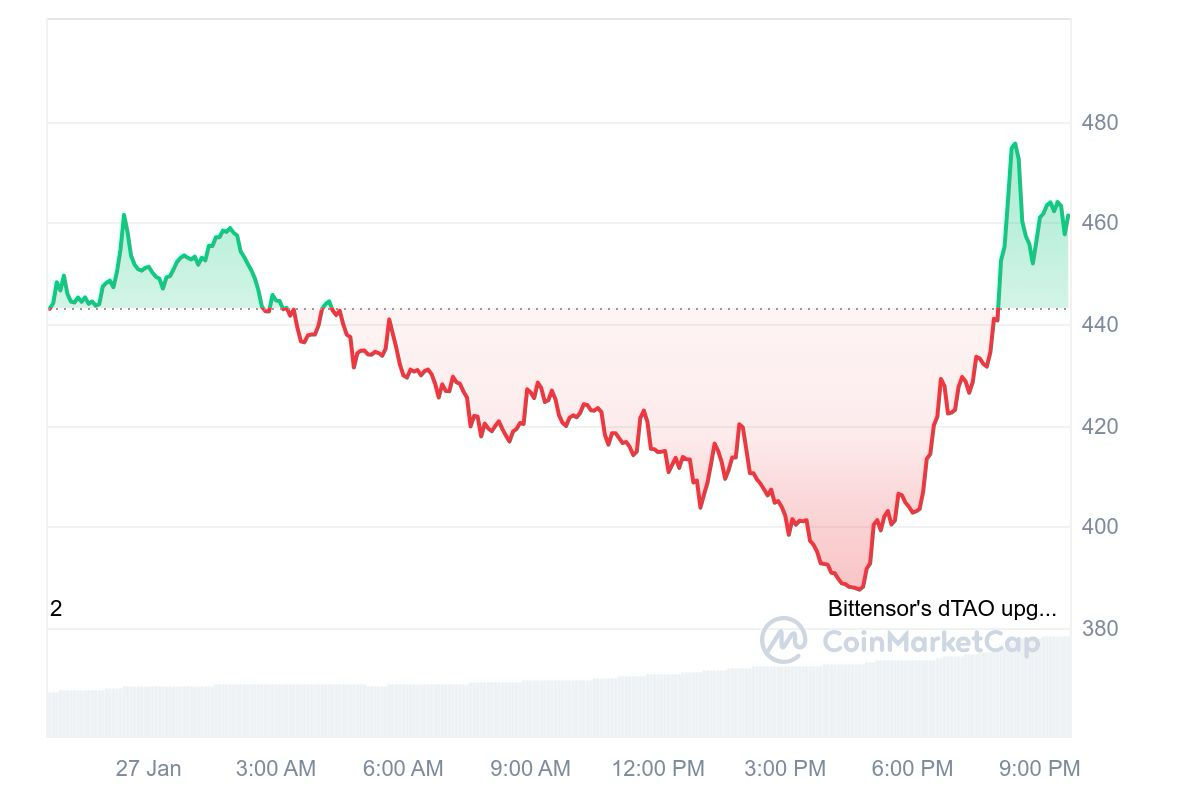 استعاد Bittensor (TAO) من انخفاض السوق اليوم الذي يتسلق بنسبة 3.8 ٪ خلال اليوم السابق ويتداول عند 465.9 دولارًا للعملة المعدنية في وقت الصحافة.