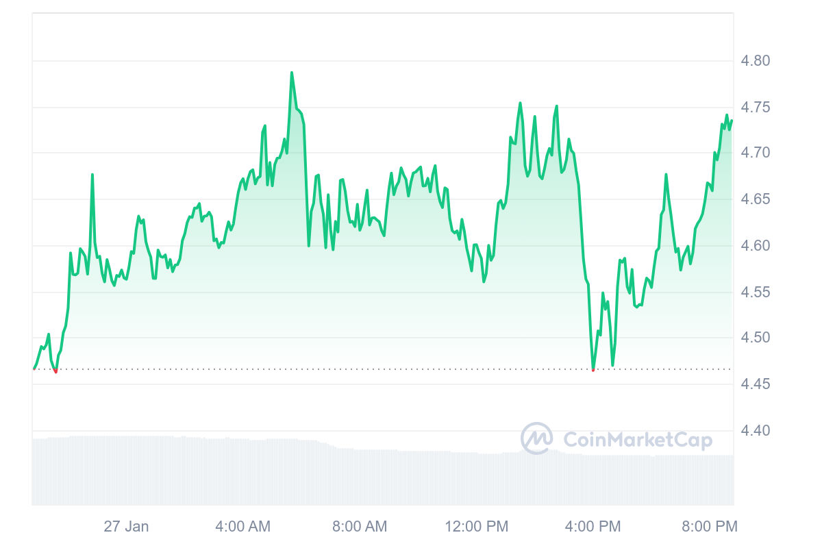 كان الحد الأقصى لسوقه يجلس عند 3.77 مليار دولار ، مما يجعلها ثالث أكبر رمز الذكاء الاصطناعي في السوق ، في حين أن حجم التداول اليومي قد تجاوز ضعف اليوم السابق عند حوالي 500 مليون دولار.