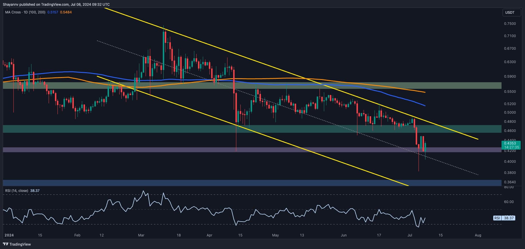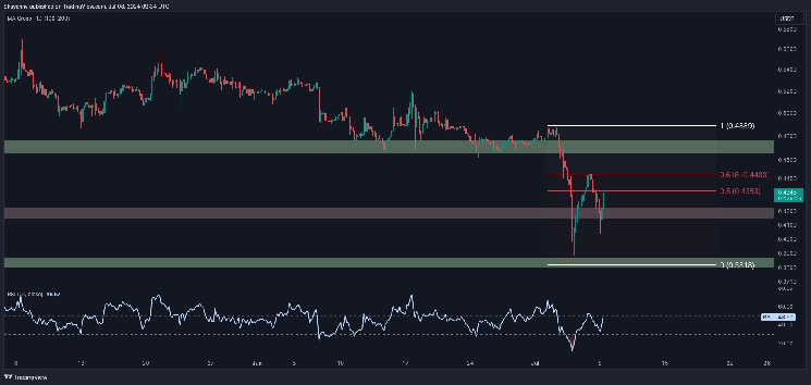 على الرسم البياني لأربع ساعات، وبعد هبوط مفاجئ، وصل السعر إلى منطقة الدعم الحاسمة عند 0.42 دولار وواجه نشاط شراء متزايد.