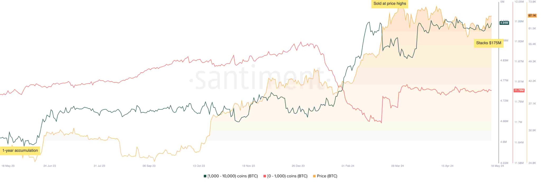 كما لوحظ، فإن عناوين البيتكوين التي تحتوي على ما بين 1000 إلى 10000 بيتكوين قد جمعت بقوة ما يقرب من 5 ملايين قطعة نقدية. تجدر الإشارة إلى تقاطع العناوين مع أقل من 1000 بيتكوين قبل أشهر قليلة من وصول البيتكوين إلى أعلى مستوياتها على الإطلاق: تراكمت الحيتان أكثر، بينما كان البيع بالتجزئة يبيع بقوة.
