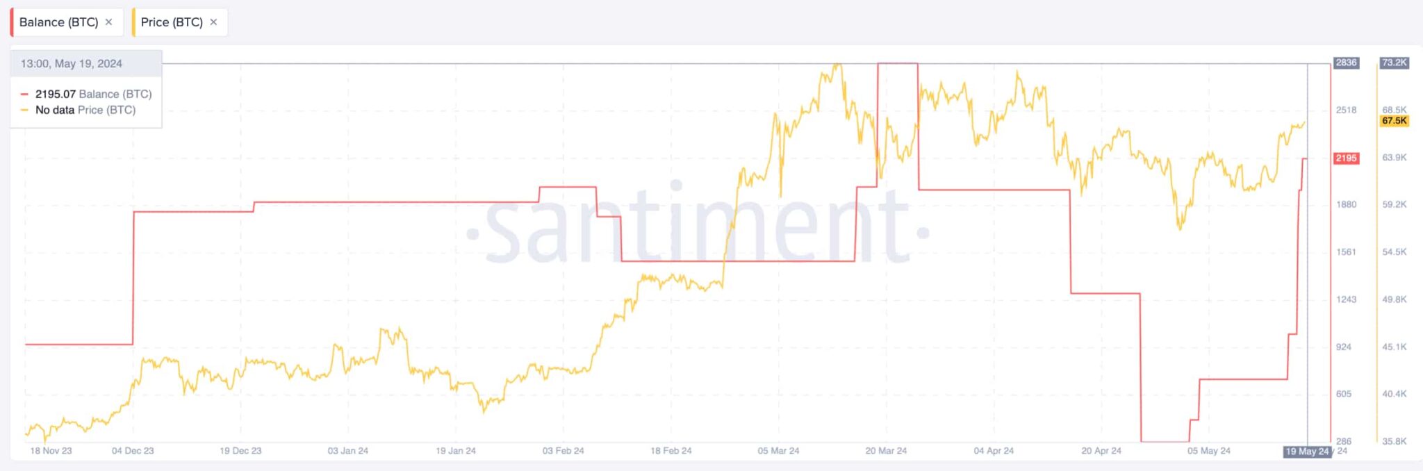 منذ 18 مايو، اشترى هذا التاجر 1,590 بيتكوين، مما أضاف إلى رصيد متزايد بالفعل قدره 1,014 بيتكوين بحلول 17 مايو. قبل شهر مايو، كان رصيده البالغ 287 بيتكوين يساوي أقل من 20 مليون دولار، وهو الآن موجود في كومة تبلغ قيمتها 175 مليون دولار تقريبًا.