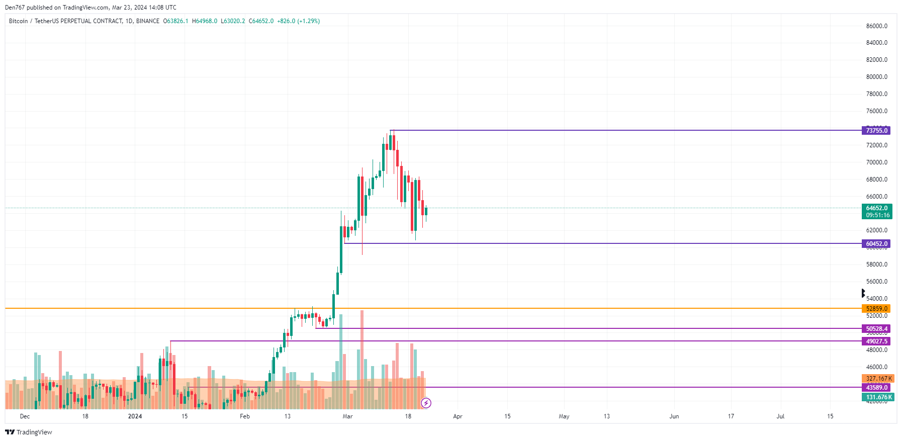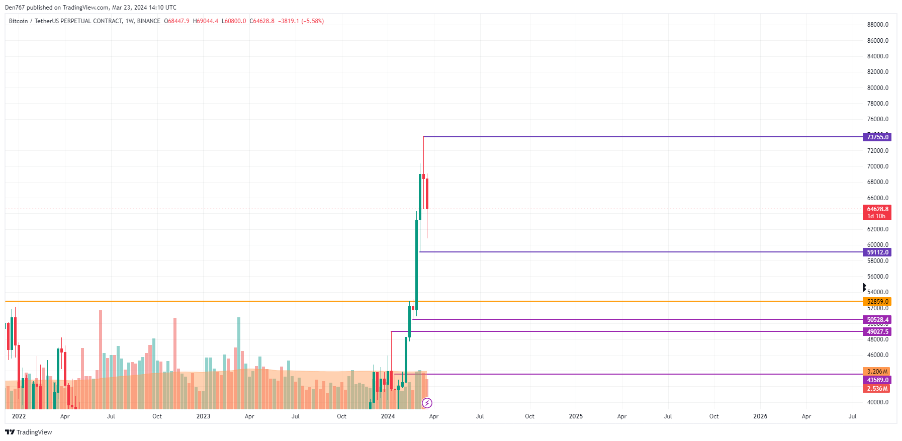 من وجهة نظر منتصف المدة، ينبغي للمرء الانتباه إلى إغلاق الشريط فيما يتعلق بقاع الشمعة السابق. إذا حدث ما دون هذا المستوى، فقد يؤدي الانخفاض إلى اختبار منطقة 60 ألف دولار قريبًا.