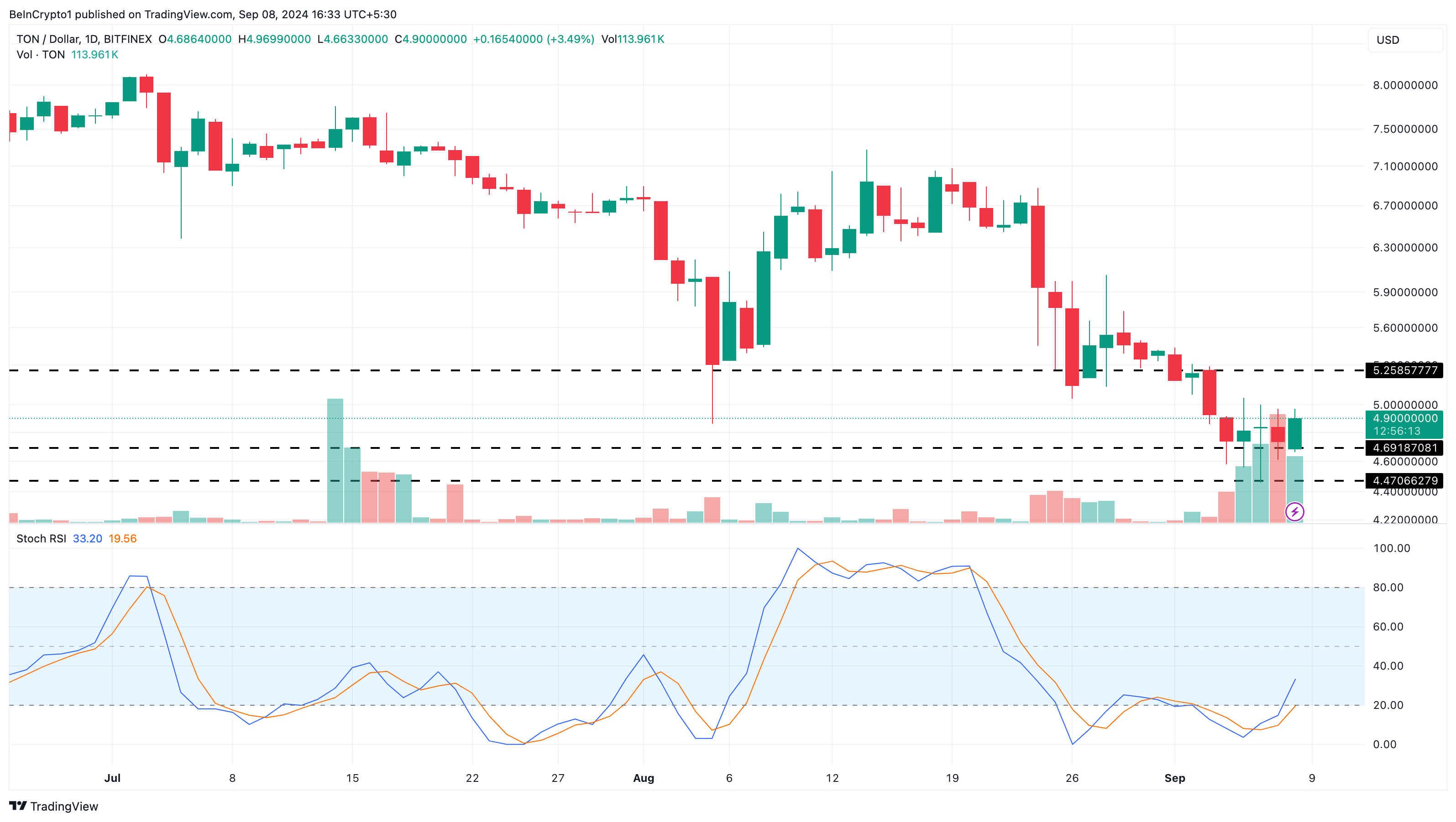 قد يؤدي فقدان هذا الدعم إلى انخفاض السعر إلى 4.47 دولار. ومع ذلك، قد ينجو سعر TON من هذا الانخفاض إذا انخفضت الأرباح المحققة. إذا حدث هذا، فقد يرتفع TON ببطء نحو 5.25 دولار.