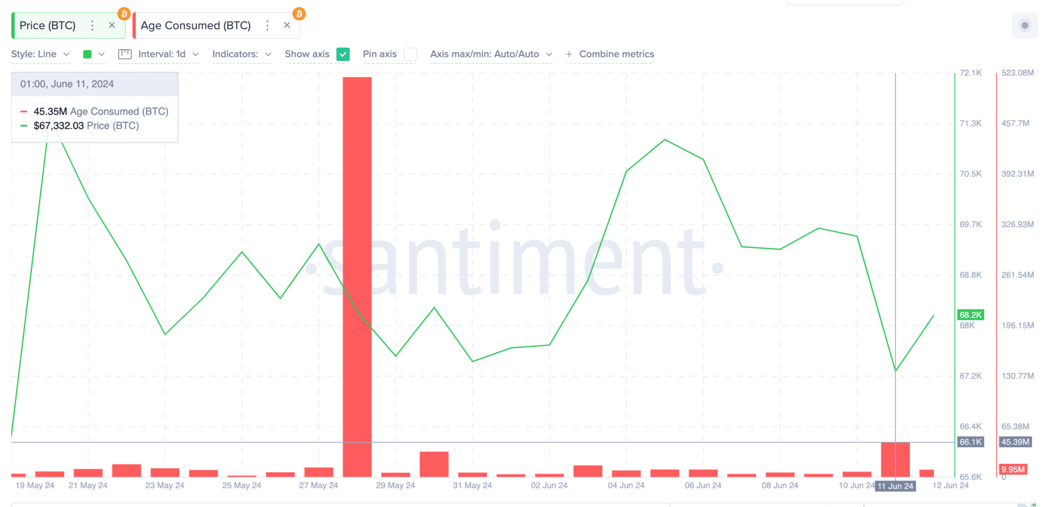 استهلك Bitcoin Age ذروة زمنية شهرية فقط بلغت 45.35 مليونًا في 11 يونيو، حيث دخل المتداولون في جنون بيع سريع في أعقاب قرار إيقاف سعر الفائدة الأخير من قبل بنك الاحتياطي الفيدرالي الأمريكي.