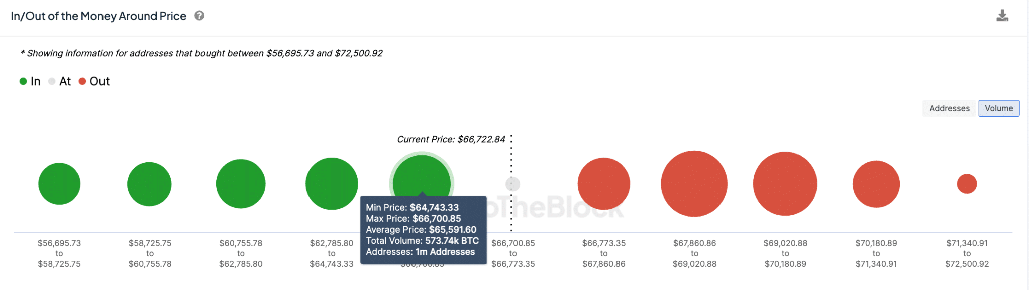 من خلال استخلاص الاستنتاجات من تحليل البيانات على السلسلة أعلاه، يبدو أن سعر البيتكوين مستعد للتماسك فوق مستوى 65000 دولار على الرغم من معنويات السوق السلبية الحالية. تؤكد بيانات IOMAP الخاصة بـ IntoTheBlock أيضًا هذه التوقعات المتفائلة لسعر البيتكوين.
