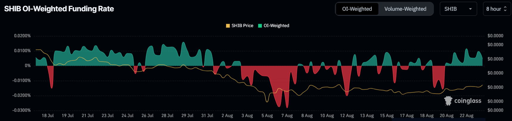 كان ارتفاع سعر شيبا إينو متوقعًا منذ فترة طويلة، والآن يدفع المستثمرون عملة الميم إلى الارتفاع. تتلقى شيبا إينو حاليًا دعمًا ثابتًا من مستثمريها، كما يتضح من معدل التمويل الإيجابي المستقر. يعد هذا الدعم الثابت أمرًا بالغ الأهمية للحفاظ على الزخم الصاعد وقد يشير إلى الثقة المتزايدة بين مجتمع شيبا إينو.