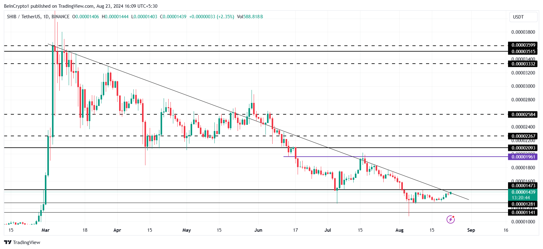 يتم تداول سعر شيبا إينو عند 0.00001439 دولار، بهدف تحويل المقاومة عند 0.00001473 دولار إلى دعم. سيؤدي القيام بذلك إلى ارتفاع عملة الميم. سيساعد هذا شيبا إينو على التحرر من الاتجاه الهبوطي الذي دام خمسة أشهر وبدء التعافي.