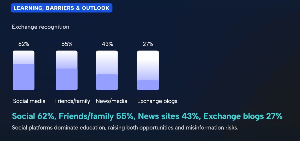 عندما يتعلق الأمر بالتعليم، تم ذكر وسائل التواصل الاجتماعي كمصدر رئيسي للمعلومات للمستجيبين. وهذا يسلط الضوء على الدور المتزايد الذي تلعبه وسائل التواصل الاجتماعي في تشكيل فهم المستثمرين للعملات الرقمية.