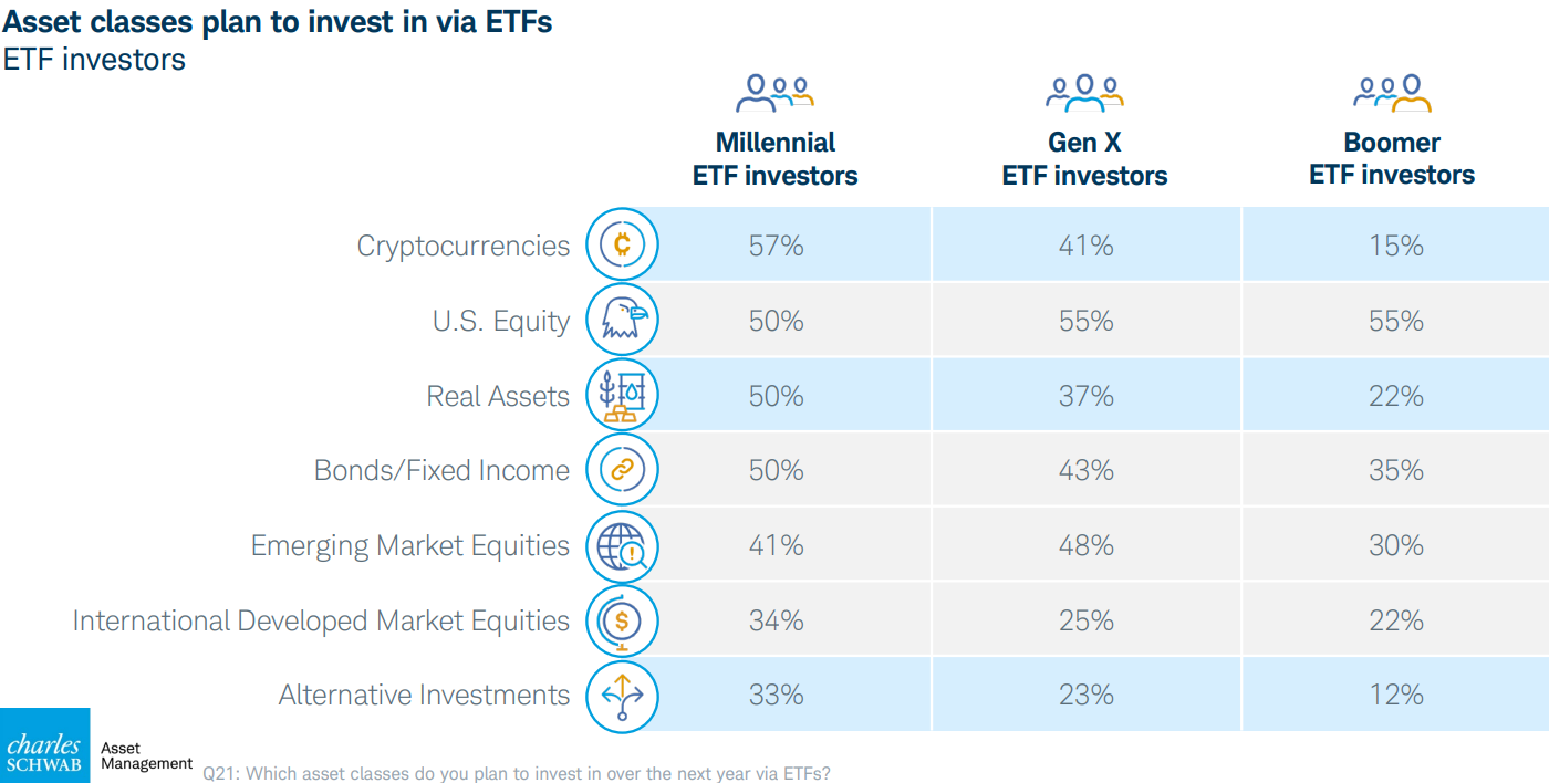 أظهر المستثمرون من جيل الألفية اهتمامًا أكبر بصناديق الاستثمار المتداولة للعملات المشفرة مقارنة بالفئات العمرية الأخرى. مصدر: شواب لإدارة الأصول