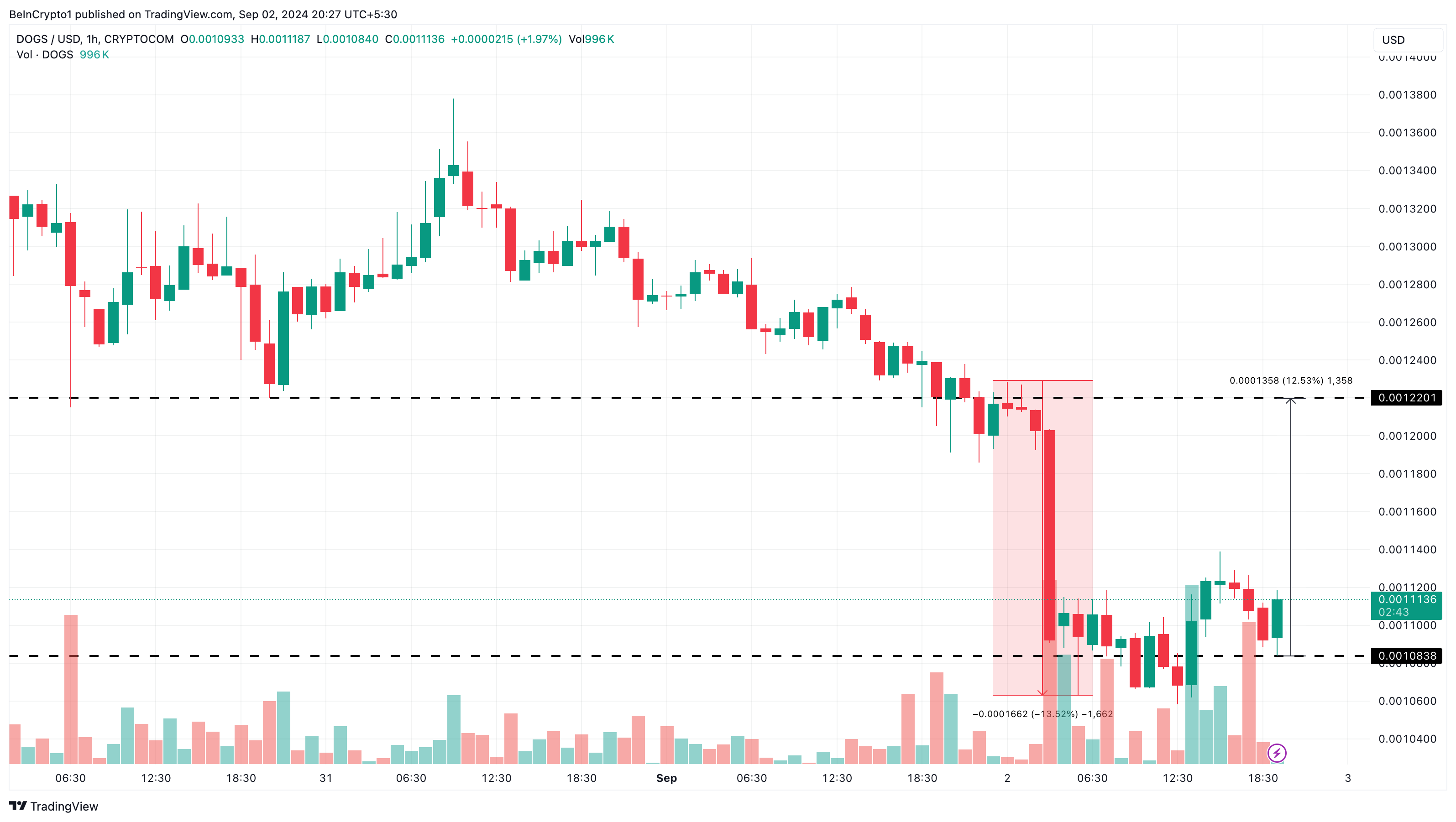 يشير التحليل الإضافي للرسم البياني للساعة إلى أن DOGS قد تقترب من اكتشاف السعر، وهي عملية مدفوعة بالعرض والطلب حيث يحدد المشترون والبائعون القيمة العادلة للرمز.