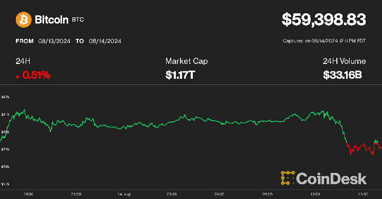 انخفضت عملة البيتكوين إلى 59 ألف دولار خلال جلسة التداول الأمريكية يوم الأربعاء، لتتراجع بشكل كامل ارتفاع الأمس فوق 61000 دولار على الرغم من طمأن تقرير التضخم في مؤشر أسعار المستهلك الأمريكي الصادر يوم الأربعاء التوقعات بخفض أسعار الفائدة في سبتمبر.
