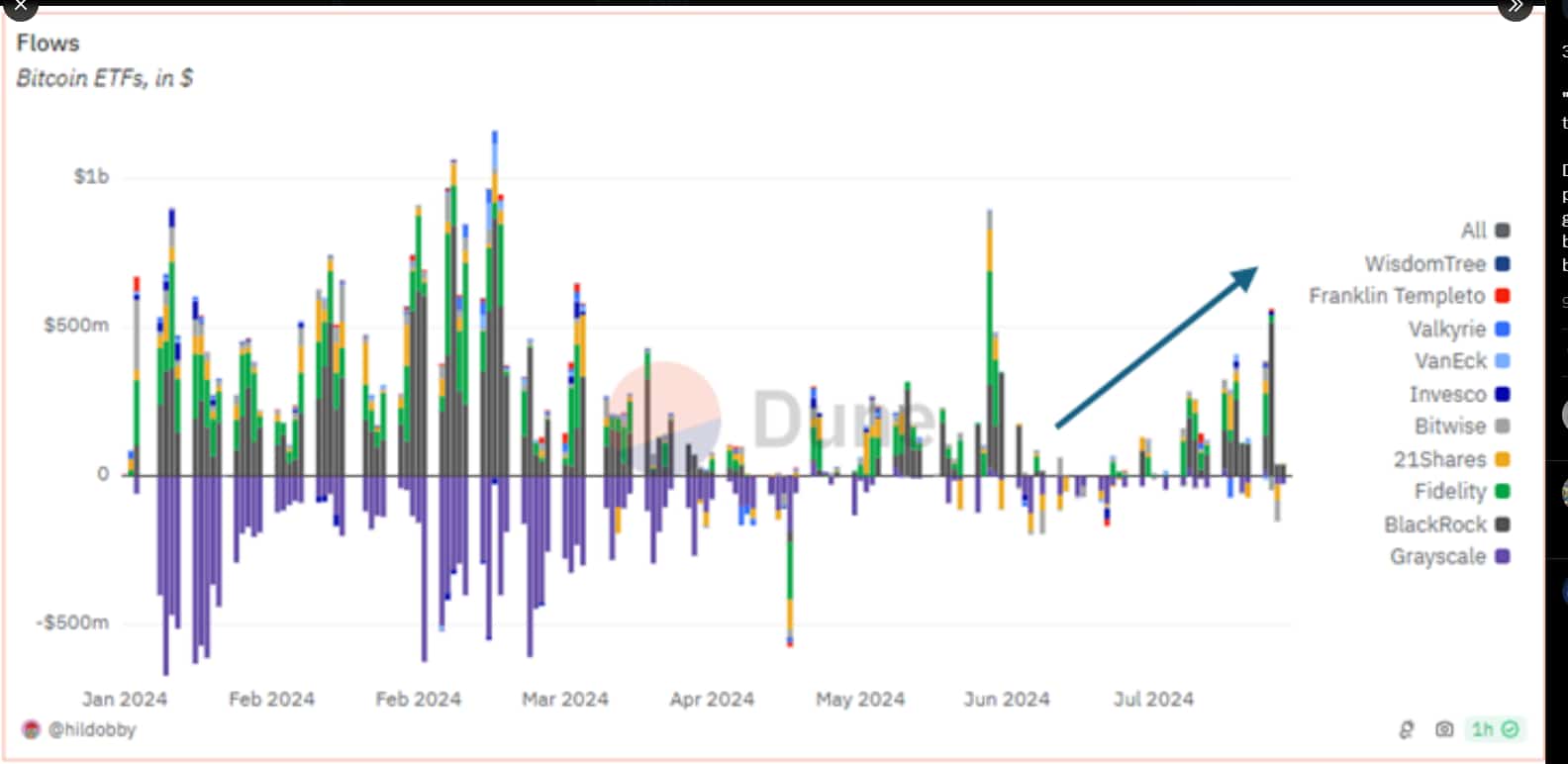 تكشف البيانات الأخيرة حول تدفقات صناديق الاستثمار المتداولة في البورصة (ETFs) الخاصة بعملة البيتكوين عن استثمارات كبيرة من قبل كبار اللاعبين المؤسسيين مثل WisdomTree و Franklin Templeton و Valkyrie و VanEck و Invesco و Bitwise و 21Shares و Fidelity و BlackRock و Grayscale.