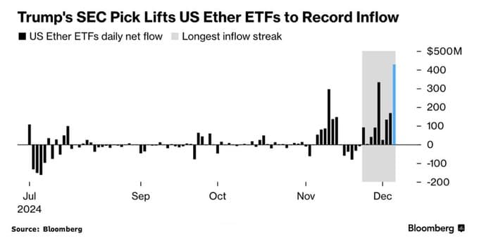 يرتبط جزء من المشاعر الصعودية لـ Ethereum بالارتفاع العام في سوق العملات المشفرة الذي بدأه التفاؤل بشأن انتخاب دونالد ترامب وسياساته المتوقعة المؤيدة للتشفير. وفي الوقت نفسه، يشهد صندوق التداول الفوري للعملات المشفرة (ETF) أيضًا تدفقات رأسمالية قياسية.