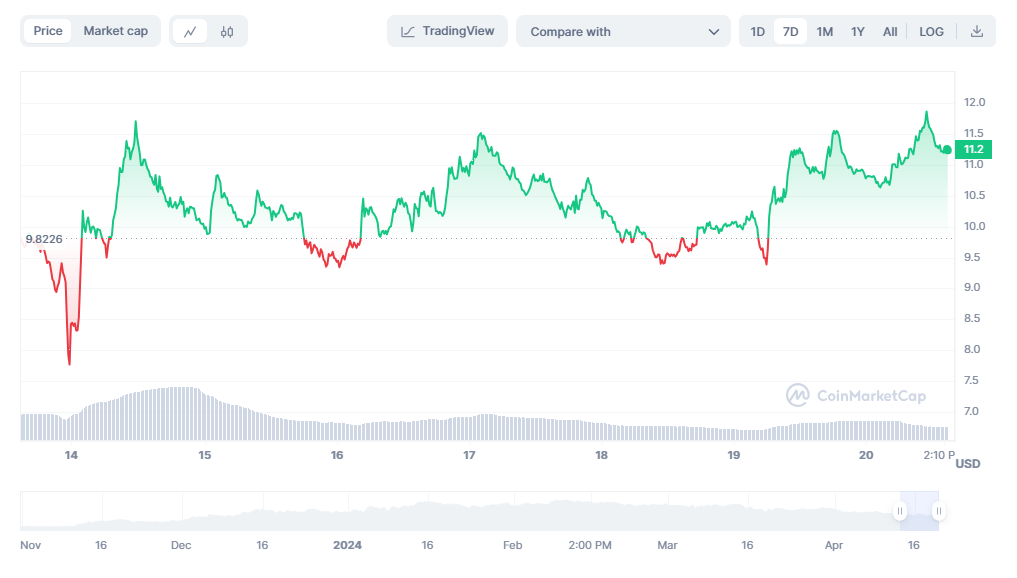وبحلول وقت النشر، تم تداول الرمز المميز عند 11.29 دولارًا، مما يعكس مكاسب يومية بنسبة 3٪ تقريبًا. وخلال الأيام السبعة الماضية، ارتفع بنسبة تزيد عن 15%.