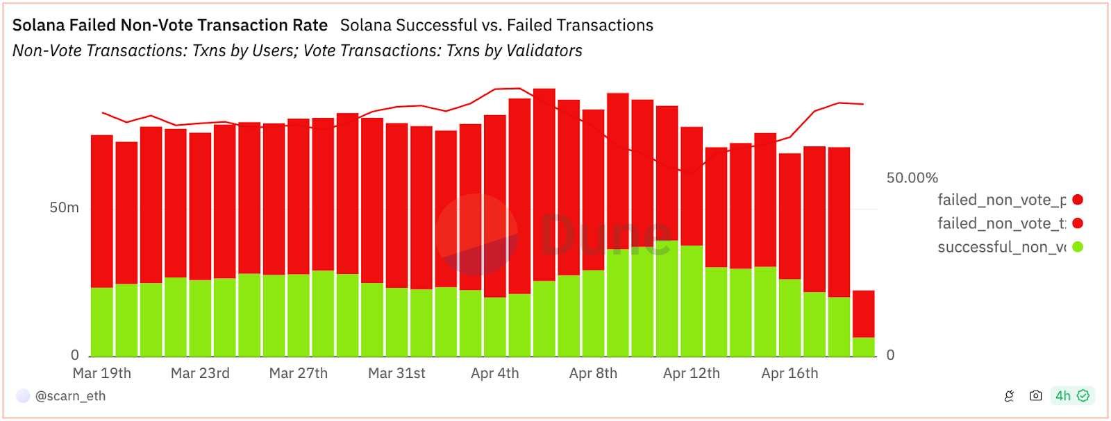 على الرغم من هذه المرونة، لا تزال مشكلات الشبكة المختلفة مستمرة حول سولانا. على الرغم من الطرح الأخير لإصلاح الشبكة الرئيسية، إلا أن معدلات فشل المعاملات المرتفعة لا تزال قائمة، حيث لا تزال 71% من المعاملات غير المصوتة تؤدي إلى الفشل اعتبارًا من 19 أبريل.