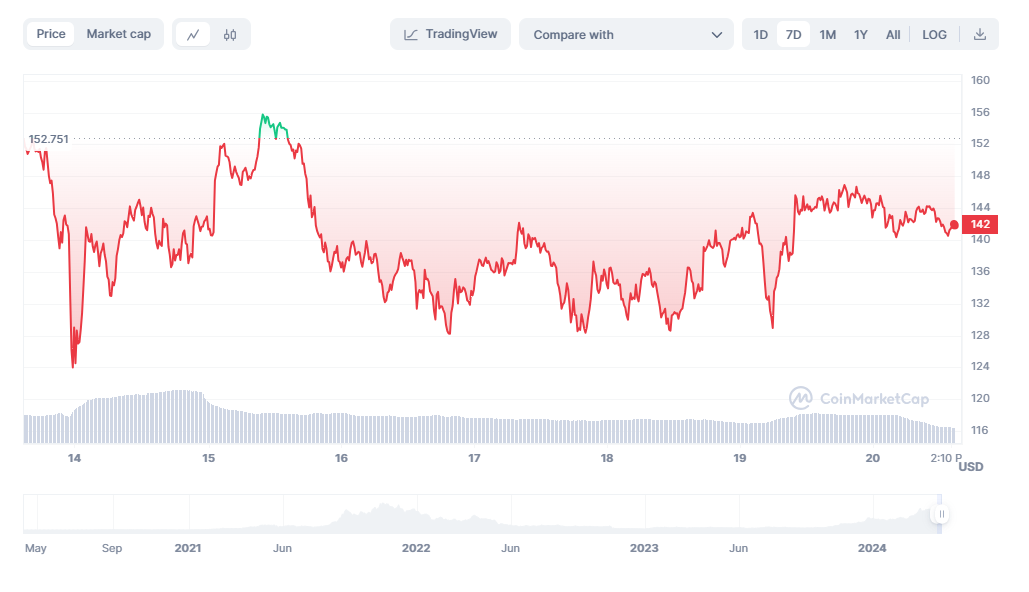 اعتبارًا من وقت كتابة المقالة، تم تداول SOL بسعر 141 دولارًا، بعد أن تم تصحيحه بأكثر من 7٪ في الأيام السبعة الماضية.