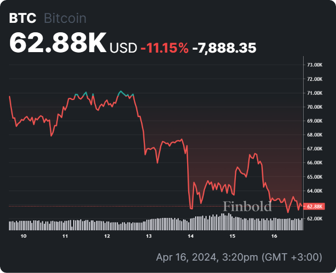 بعد أن وصلت إلى أعلى مستوى يومي عند حوالي 66,300 دولار، تراجعت عملة البيتكوين وتكافح للحفاظ على سعرها فوق 63,000 دولار. وفي وقت النشر، كان تداول بيتكوين عند ٦٣٢٢٥ دولارًا، وهو ما يمثل تصحيحًا بنسبة ٥٪ تقريبًا خلال الـ ٢٤ ساعة الماضية.