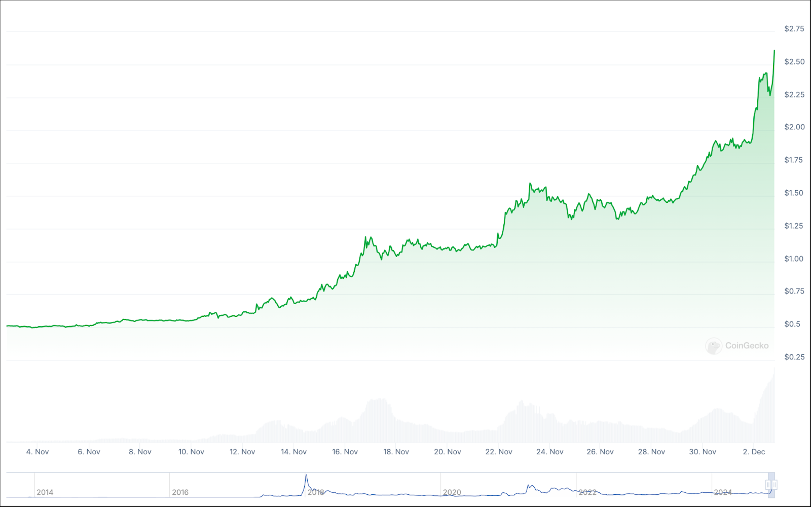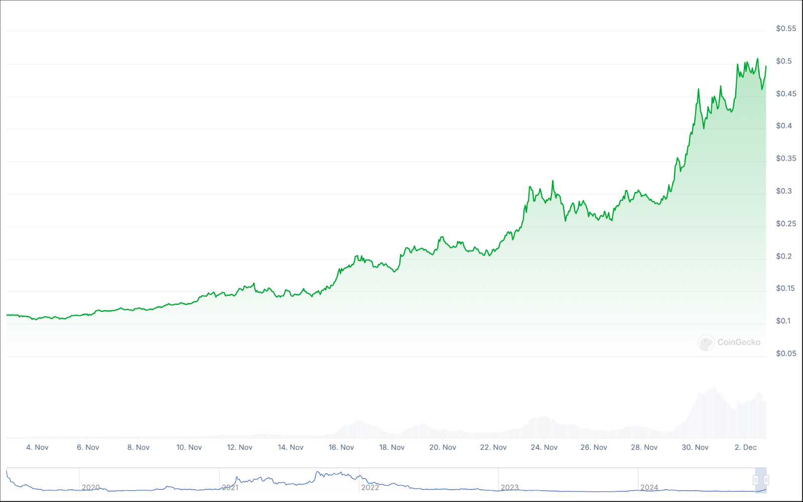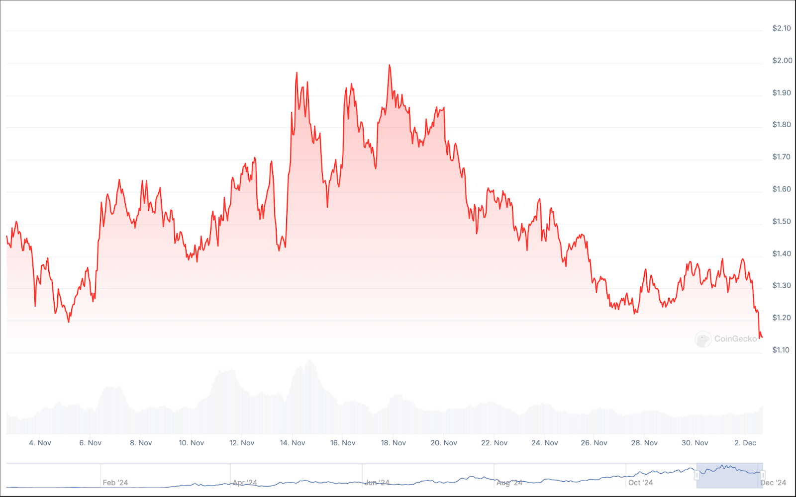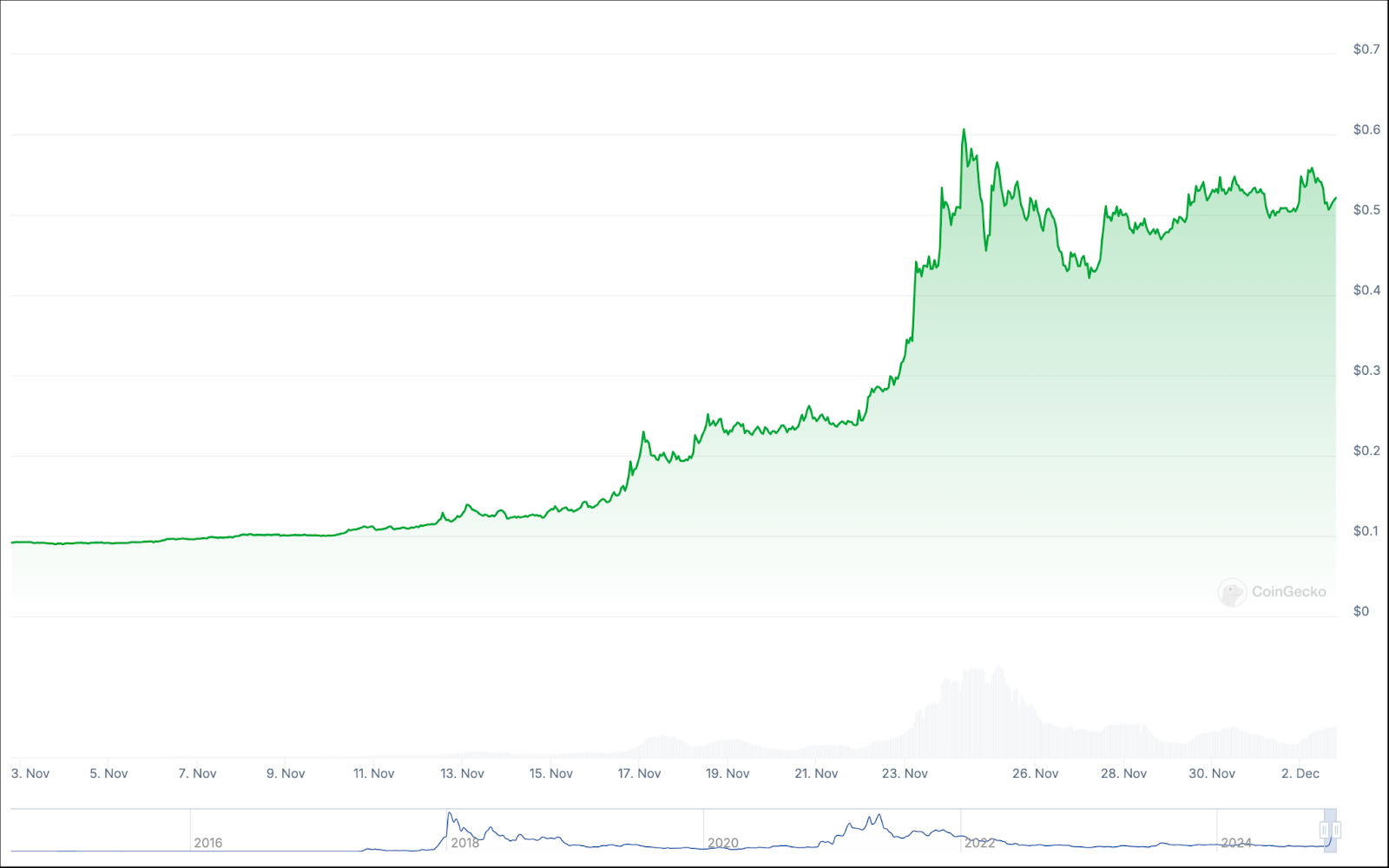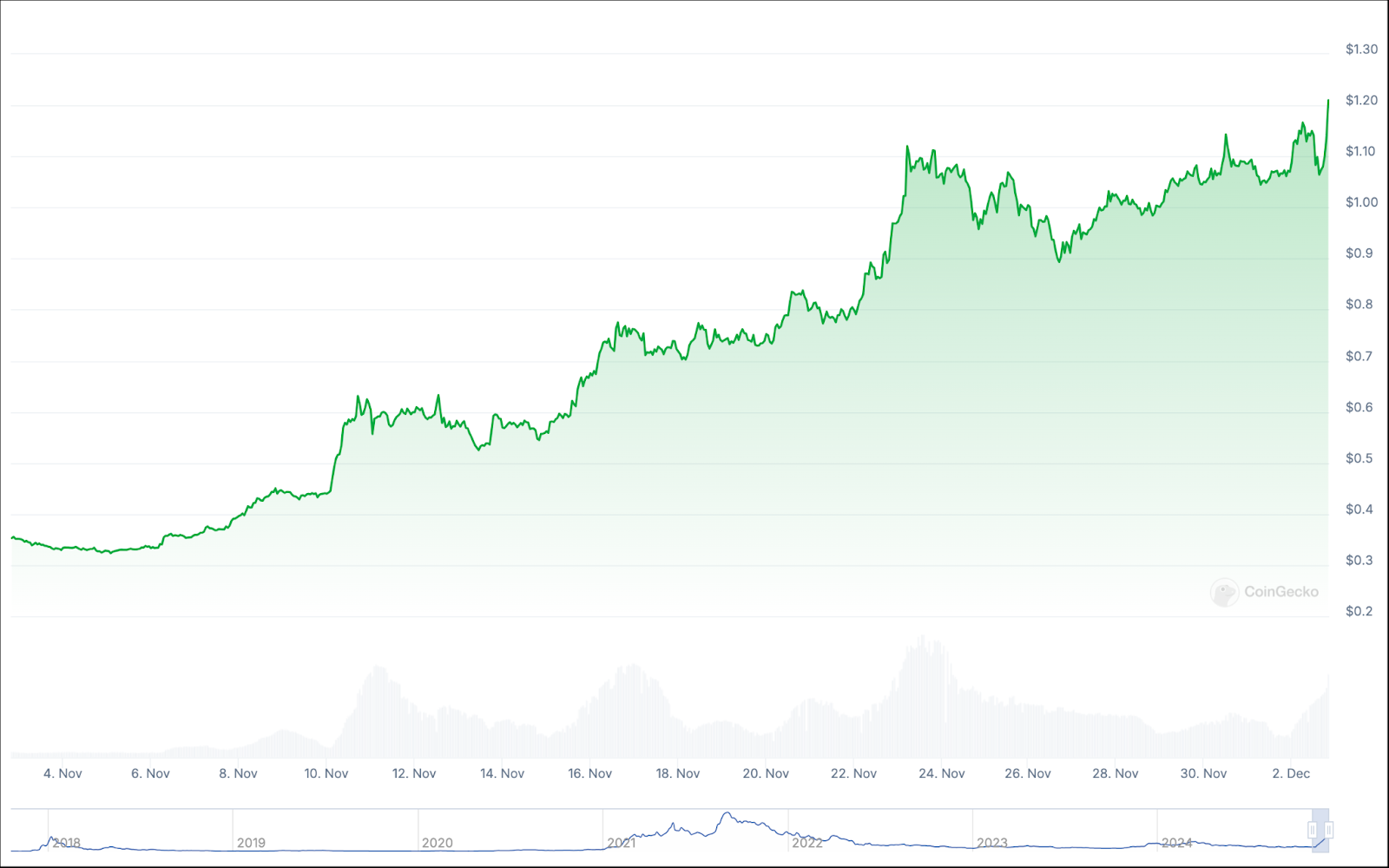 كان ارتفاع سعر كاردانو أيضًا خطيًا تمامًا على مدار عام 2024. ومن الجدير بالذكر أيضًا أن سعر كاردانو لا يزال أقل تمامًا من أعلى مستوى له على الإطلاق، وهو 3.09 دولار، مقارنة بالسعر الحالي البالغ 1.20 دولار.