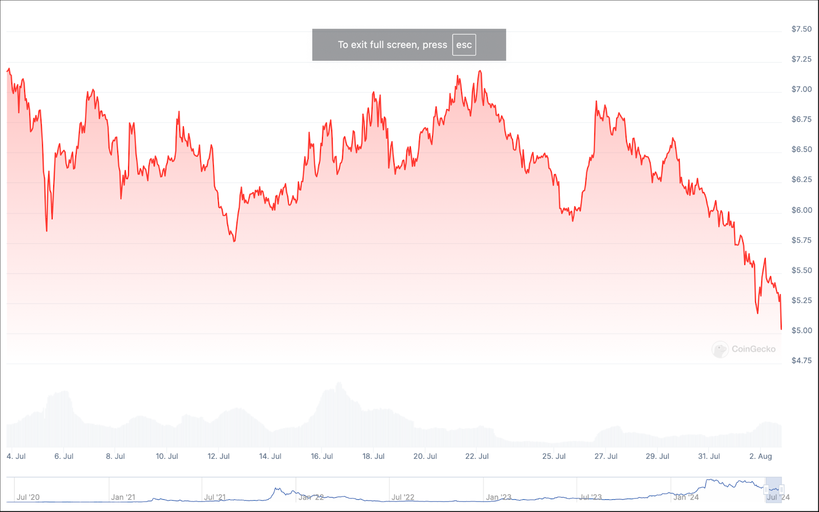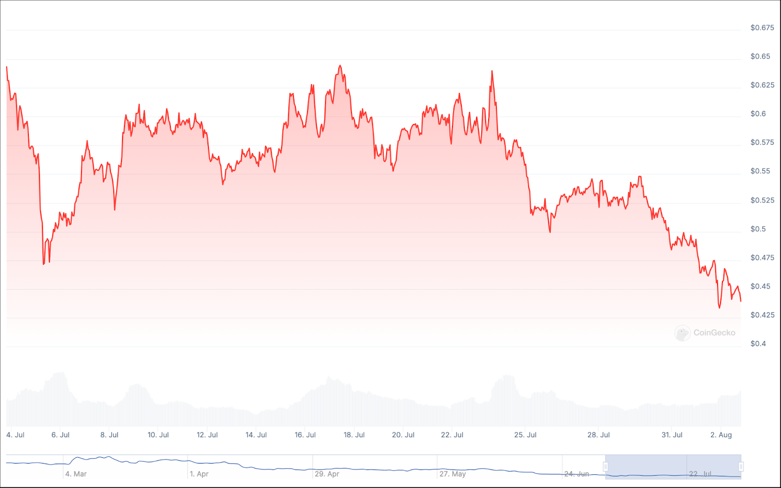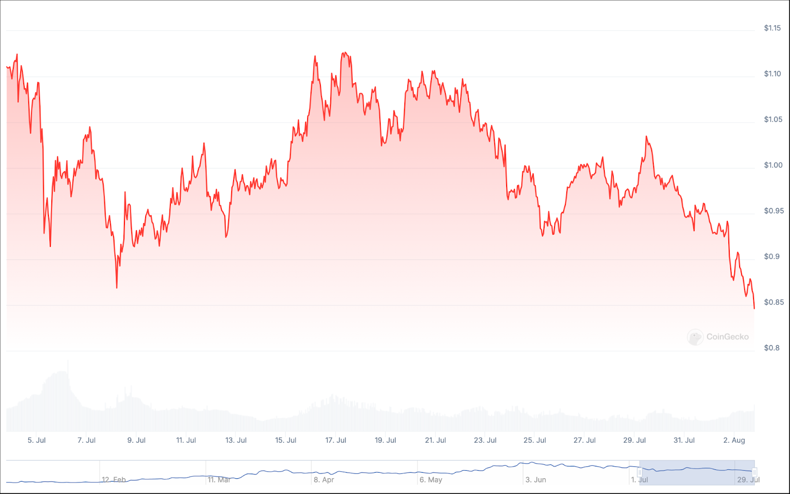 على عكس بعض الإدخالات الأخرى في قائمتنا، فإن العائدات الشهرية والسنوية لعملة Starknet متشابهة إلى حد كبير. فقد شهد شهر يوليو خسارة العملة لأكثر من 27% من قيمتها، وهو ما يعادل انخفاضًا سنويًا يزيد عن 30%.