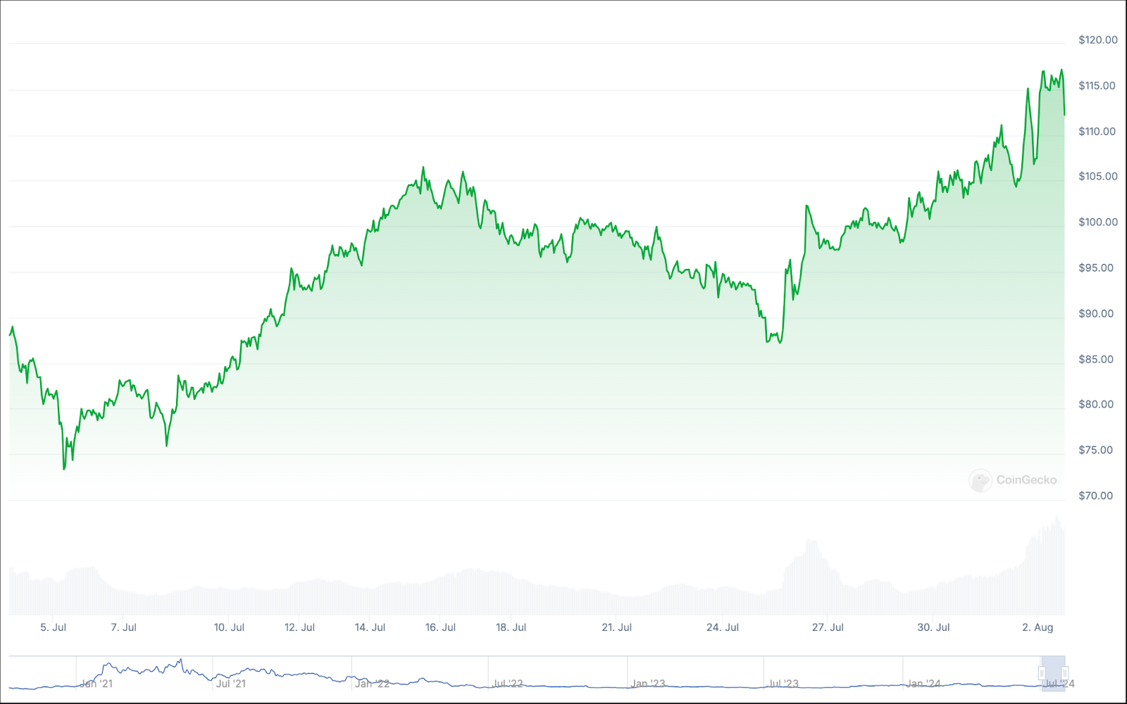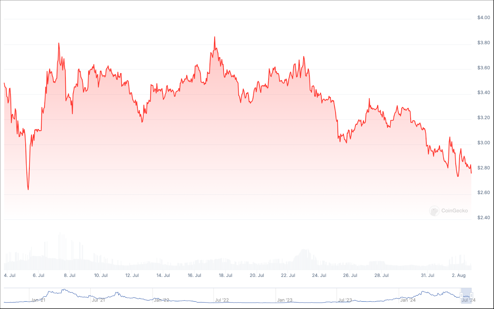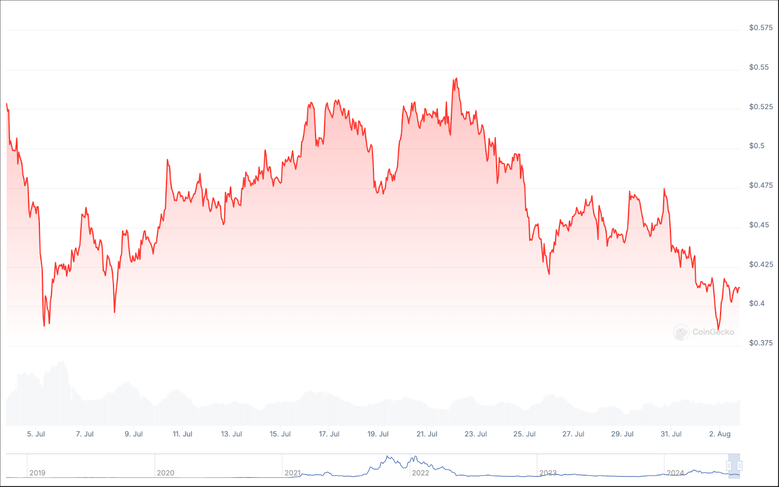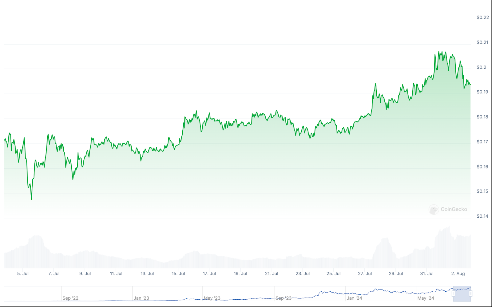 على عكس بعض الإدخالات الأخرى في قائمتنا، فإن العائدات الشهرية والسنوية لعملة Starknet متشابهة إلى حد كبير. فقد شهد شهر يوليو خسارة العملة لأكثر من 27% من قيمتها، وهو ما يعادل انخفاضًا سنويًا يزيد عن 30%.