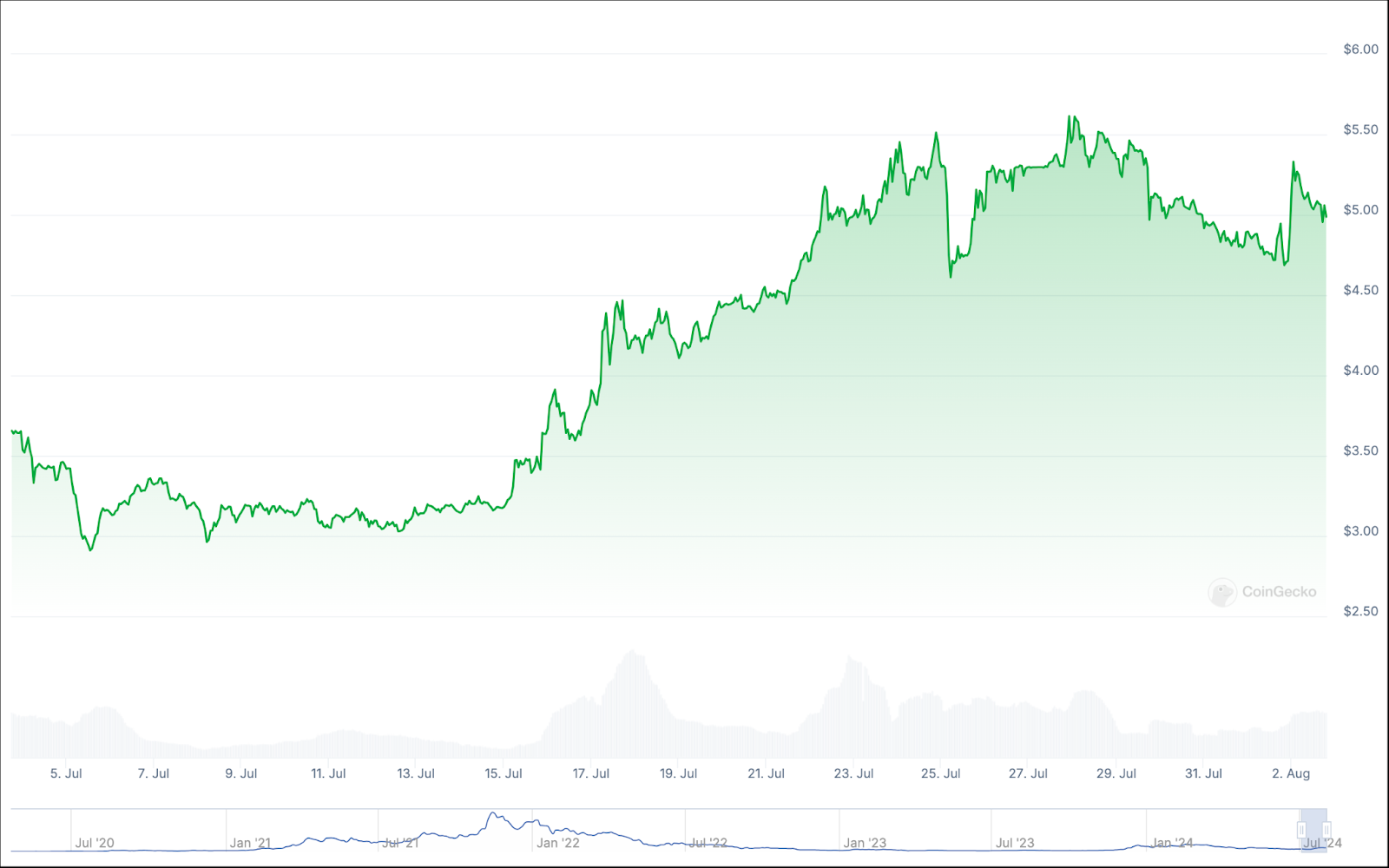 تعتبر Kaspa إدخالًا شائعًا آخر في قائمتنا، ويبدو أنها انفجرت على الساحة في عام 2024، مع مكاسب سنوية تزيد عن 360%، مما يجعلها واحدة من العملات المشفرة ذات الأداء الأفضل ليس فقط في شهر يوليو، ولكن في عام 2024 بأكمله حتى الآن.