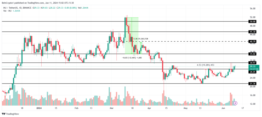 سعر Injective، الذي يتم تداوله عند 29.3 دولارًا أمريكيًا، يقترب من مستوى المقاومة عند 30.9 دولارًا أمريكيًا، ولكن من أجل اختراقه، يجب أن يستمر الارتفاع. وبالنظر إلى أن العملة البديلة قد خرجت مؤخرًا من منطقة الدمج بين 28.0 دولارًا و21.3 دولارًا، يبدو ذلك ممكنًا.