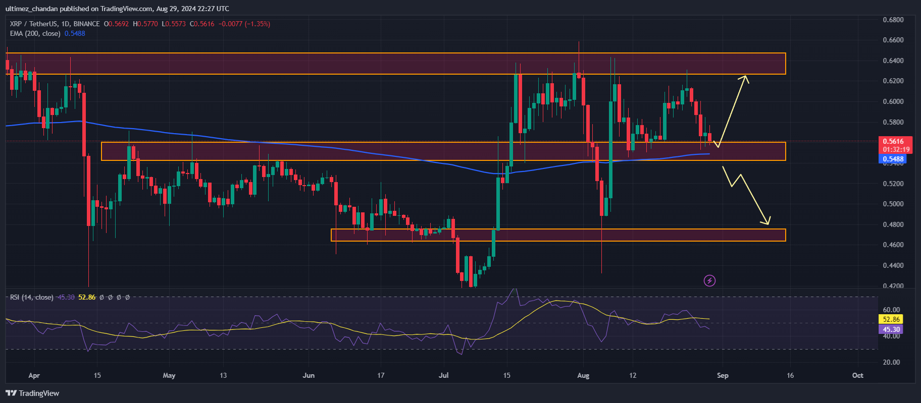 وفقًا للتحليل الفني الخبير، يحظى XRP حاليًا بدعم قوي من المتوسط المتحرك الأسي 200 (EMA) على الإطار الزمني اليومي والمستوى الأفقي 0.546 دولار. ومع ذلك، فإن مؤشر القوة النسبية (RSI) الخاص به أقل من 50، مما يشير إلى انعكاس محتمل للسعر.