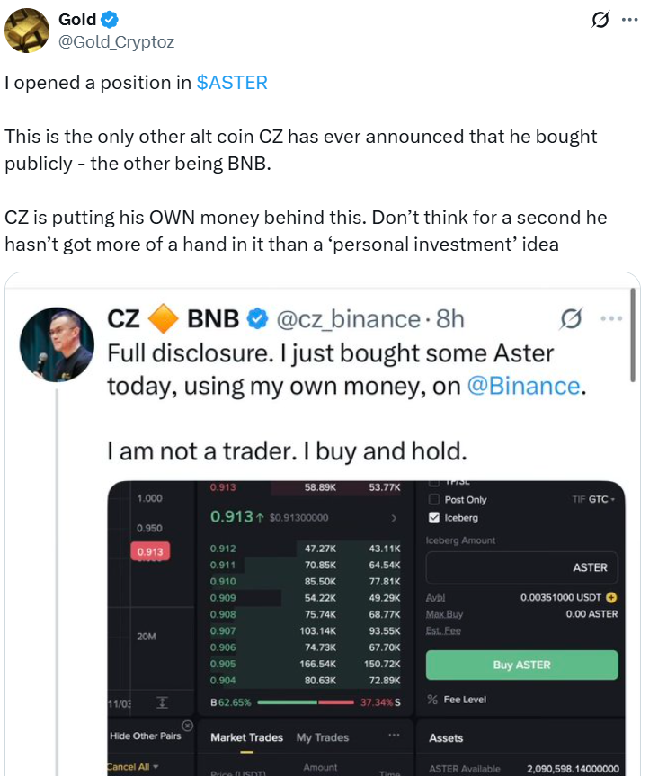 أعلن أحد المتداولين تحت اسم “Gold” على X أنهم فتحوا مركزًا في Aster بعد منشور CZ، موضحًا أن هذه هي المرة الأولى التي يعلن فيها CZ عن شراء رمز مميز خارج BNB.