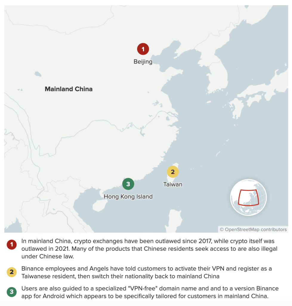 قام بعض المستخدمين بحفظ حساباتهم على منصات التداول واستمروا في استخدامها بعد الحظر، متجاوزين القيود الجغرافية باستخدام VPN. وفي مايو 2023 وحده، بلغ حجم مبيعات المتداولين الصينيين على Binance 90 مليار دولار – أي ما يقرب من 20% من الإجمالي. وفقًا لـ CNBC، نصح موظفو البورصة المستخدمين من الصين بالتهرب من عمليات التحقق من KYC.