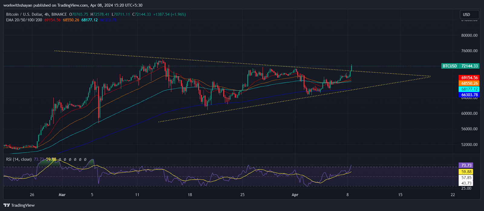 اخترق سعر البيتكوين فوق تشكيل المثلث المتماثل في الساعات الأخيرة، مما يشير إلى زخم شراء قوي من المشترين. اخترق المشترون مستوى 72 ألف دولار، بهدف إعادة اختبار ATH هذا الأسبوع. حتى وقت كتابة هذا التقرير، يتم تداول سعر البيتكوين عند 72,267 دولارًا، مرتفعًا بأكثر من 4.5٪ خلال الـ 24 ساعة الماضية.